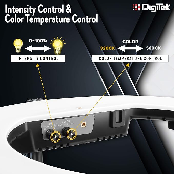 At the core of the Digitek 18 inch ring light is its versatile bi-color lighting system. Users can easily adjust the color temperature between 3200K and 5600K, allowing seamless transitions from warm to cool lighting. This flexibility is essential when working in different environments or adapting lighting to match skin tones, backgrounds, or ambient conditions. In addition to color control, the brightness can be adjusted smoothly from 0% to 100%, enabling precise control over light intensity without sudden jumps or flicker.
